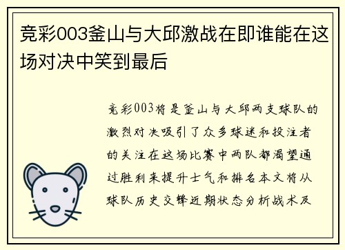 竞彩003釜山与大邱激战在即谁能在这场对决中笑到最后